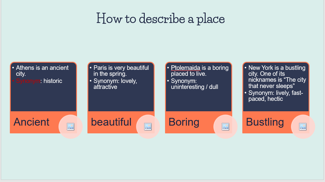 | describe places 4 This multimedium was created by me as a PowerPoint. It was print-screened and adjusted for the purposed of our lesson. Δημιουργός: CHRYSI NTINA |